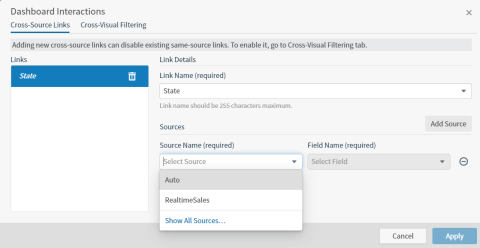 Cross-source links are defined on the Cross-Source Links tab of the Dashboard Interactions dialog. Each cross-source link on your dashboard must use unique sources and fields. There is a one-to-one relationship between cross-source link names and your data fields. You cannot create multiple cross-source links for the same data field. In addition, you cannot use the same cross-source link name for multiple data fields.