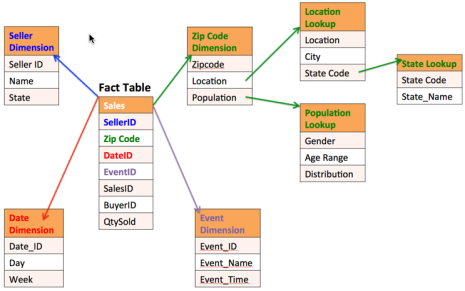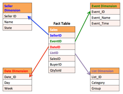For example, analyzing quantities sold (fact) and price of tickets (fact) by event would be one context. Another context might be to analyze the same facts by seller. Fact tables may be missing the descriptions needed for categorizing and analyzing the data. Combining fact tables with lookup tables may be necessary to conduct proper data analysis.