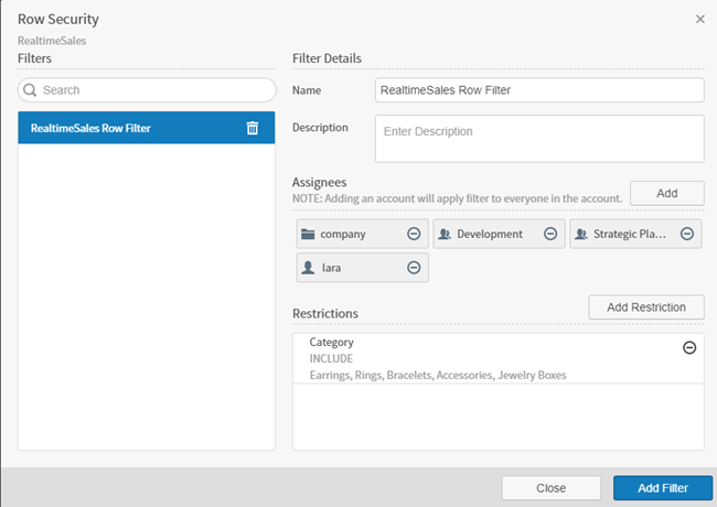 When all row security definition modifications have been made, select Close to close the Row Security dialog.