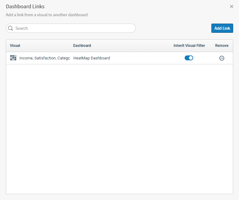 By default, Inherit Visual Filter is enabled, and the dashboard passes the filters currently used on the dashboard (or the filters applied based on what is selected when the dashboard link occurs) to the linked dashboard. If you do not want the filters from the dashboard carried over, disable Inherit Visual Filter. The filters are only carried over if the dashboards are using the same data source configuration.