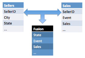 For example, if a table in one data repository contains the IDs and address information of sellers and another table in another data store contains IDs, events, and sales information for sellers, these disparate fields can be fused into one sellers table with the three fields joined and accessible (as shown below).