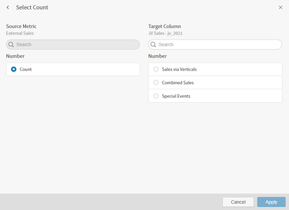 Select Add Count to open the Select Count work area. Select a source field in the Source Metric list and a Target Column to list which source field should be used, then select Apply to apply your changes.
