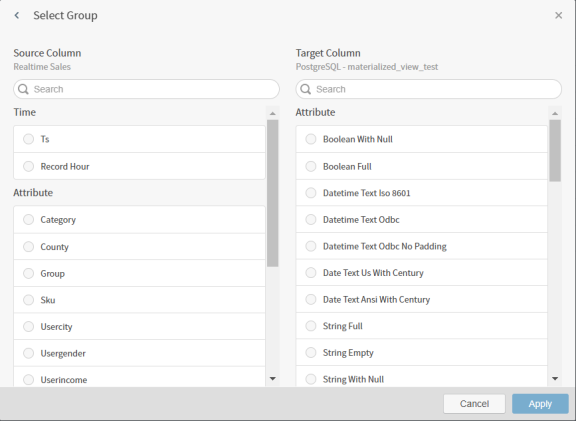 Select a source field in the Source Column list and a target column in the Target Column list to which the source field should be mapped. Aggregated data for the source field will be taken from the target column to provide the results of the query.