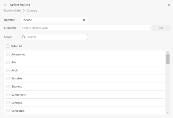 Select a source field for the filter. Use the search box at the top of the list to quickly locate a source field in the list. The Select Values dialog appears.