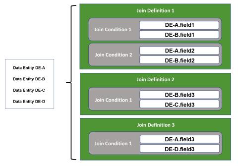 If there are more than two data entities in a Fusion data source definition, a single join definition can be specified for each unique combination of the included data entities. For example, if you have four data entities in your Fusion data source definition (sources A, B, C, and D), you can specify six join definitions, one each for these data entity combinations: A+B, A+C, A+D, B+C, B+D, and C+D.