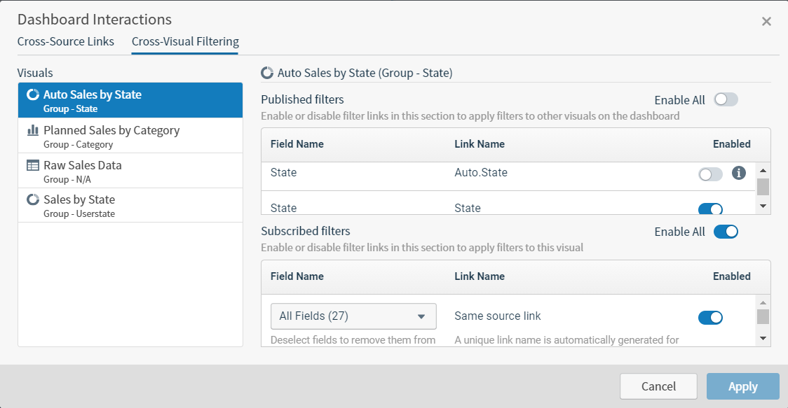 The Cross-Visual Filtering tab of the Dashboard Interactions dialog allows you to specify which same-source and cross-source links each dashboard visual publishes and which each visual subscribes to. The Dashboard Interactions dialog can be accessed by selecting on the dashboard icon bar and then selecting the Cross-Visual Filtering tab.