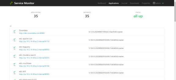 The Applications view shows all the Composer microservice types used in your installation. It also identifies the instance URLs, and indicates how many instances there are of each and how long they have been running. If more than one instance of a microservice is running, you can expand the microservice type to see the specific instance URLs.