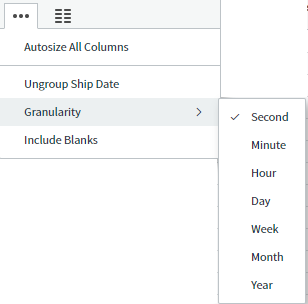 Shown only for time fields used to group the table, this option allows you to change the granularity of the grouped time field. Options vary based on the granularity you define at the source level. |