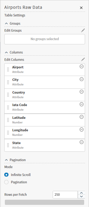 next to Edit Columns on the sidebar. The Table Settings sidebar changes and only the fields available in the data source are listed.