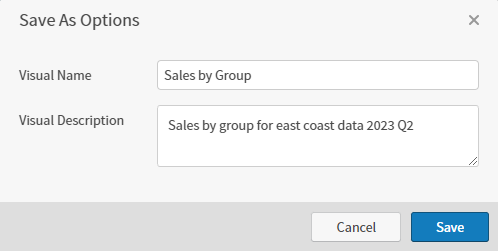 Specify a new visual name in the Visual Name field, optionally add or edit the Visual Description, and select Save. Composer adds a copy of the visual with the new name to the visual gallery.